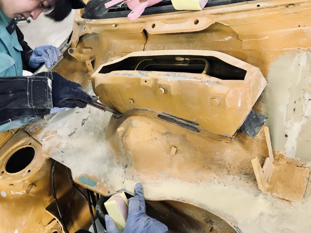 私も、エンジンを降ろした「空っぽ」のエンジンルームの中に入らせてもらって、やすりがけをお手伝いしてきました!