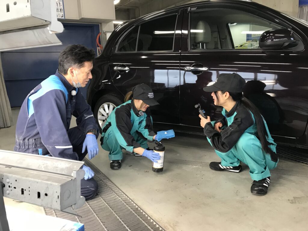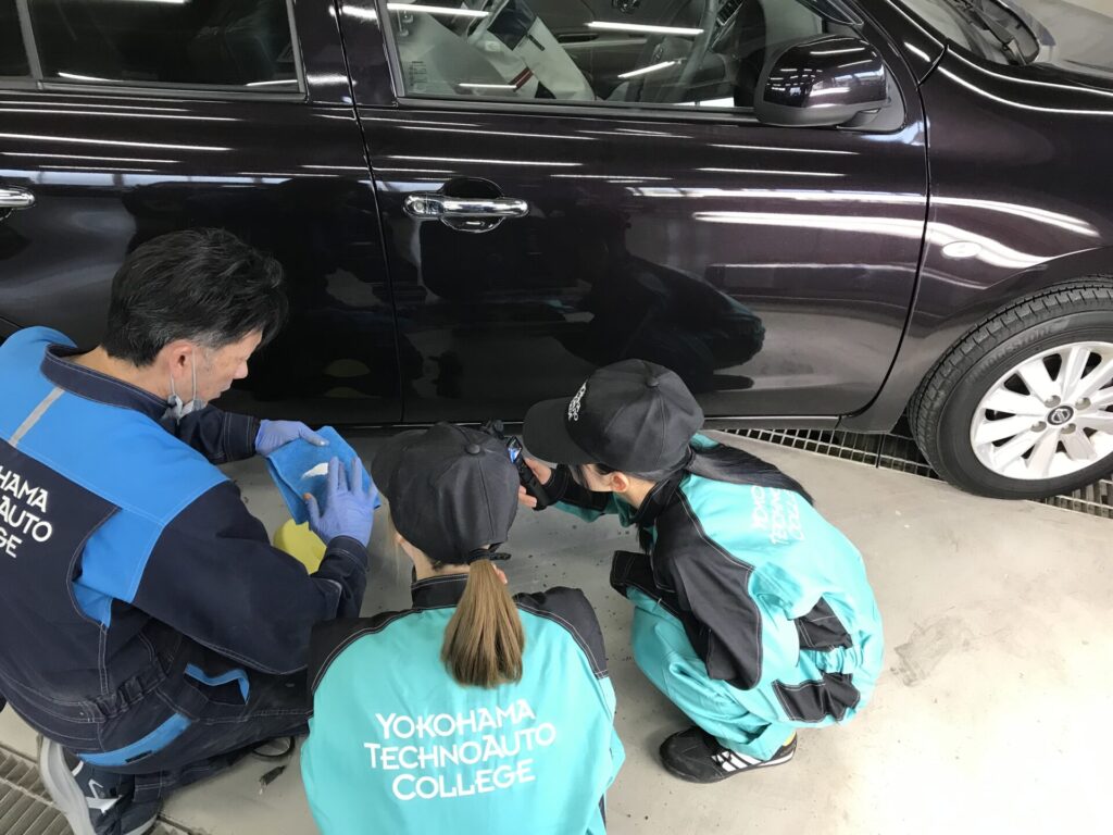 「これってもしかして教材にもってこいなのでは!?」となり、さっそく実習室へクルマを移動。よく観察してみると、「これなら表面だけでイケそう」となり、コンパウンドで処理することに。