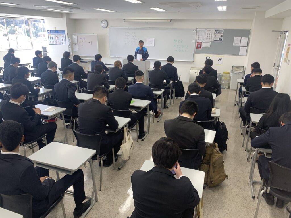 入学前オリエンテーションとして、入学式の集合時間や場所、服装などについて説明がありました。そのあとは一般教養(数学)の確認テストを行って本日は終了です。