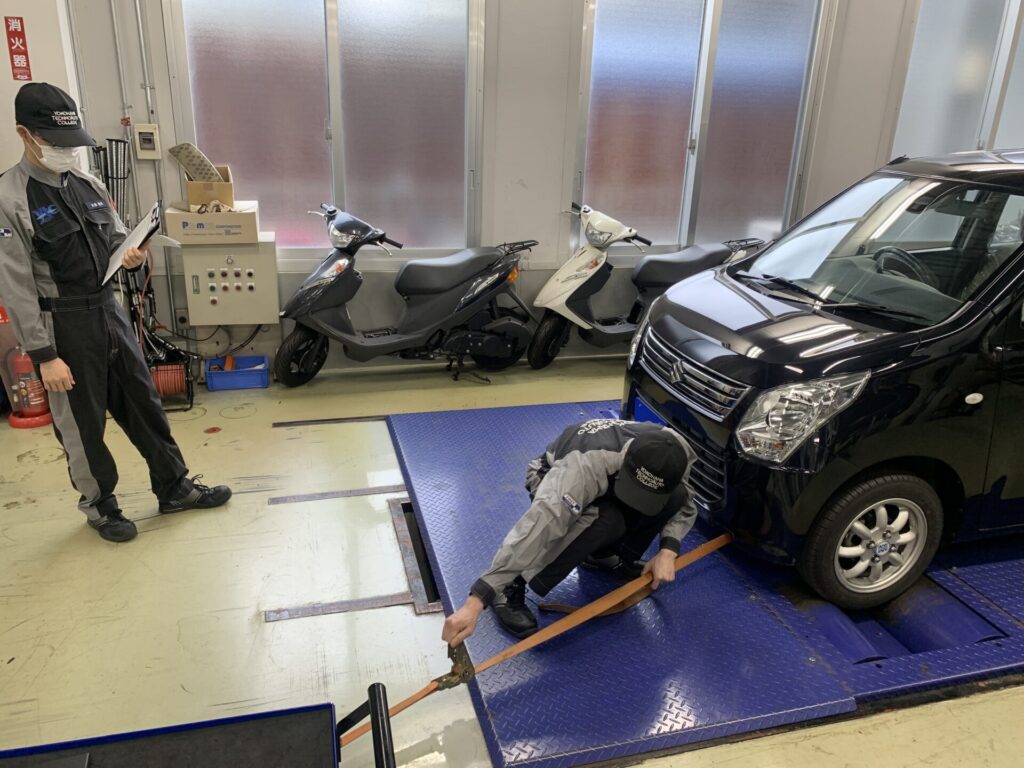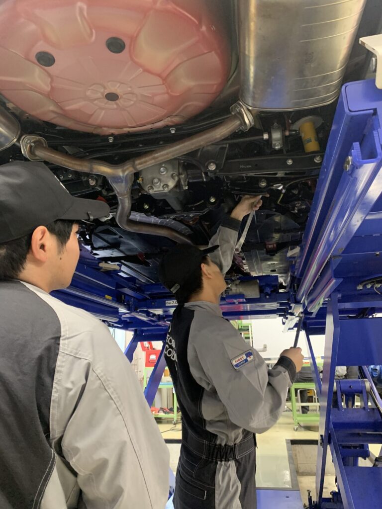 シャシダイナモテスタなどの計測器に車両を設置した際の固定具の使い方、車両のリフトアップからタイヤの前後ローテーション、アライメントテスタの使用方法などを行いました。