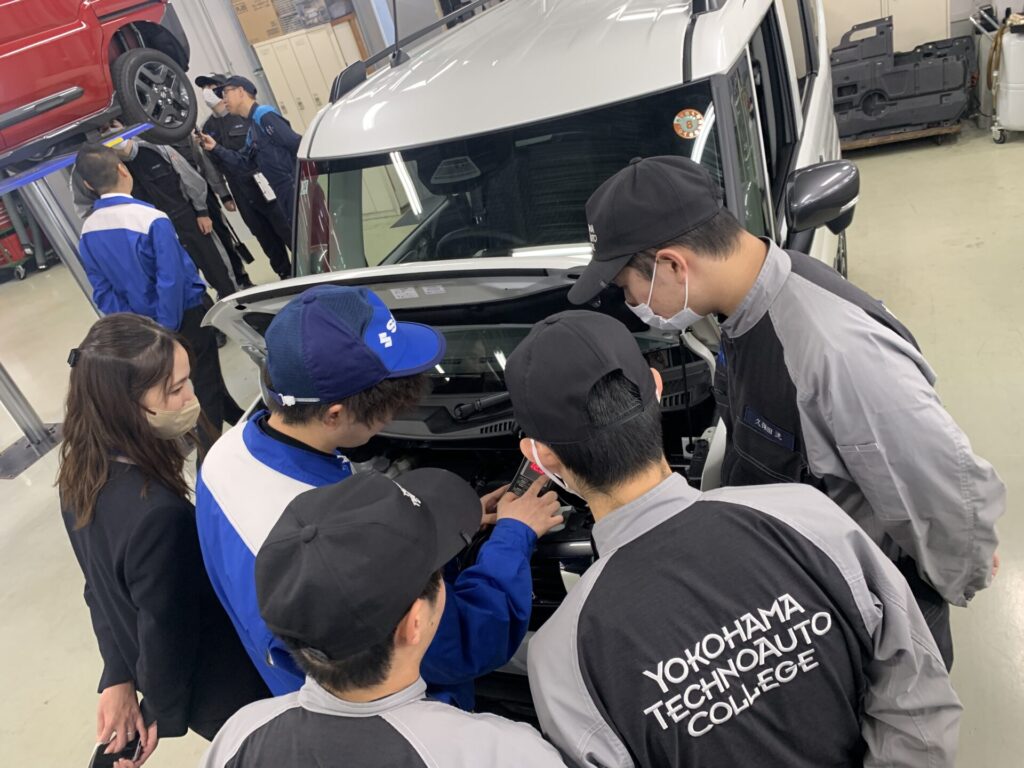 マイルドハイブリッドシステムについて講義を受けたのち、実車スペーシアを使用して構成部品を確認し、ハイブリッド車両のバッテリ点検や充電の点検作業を行いました。