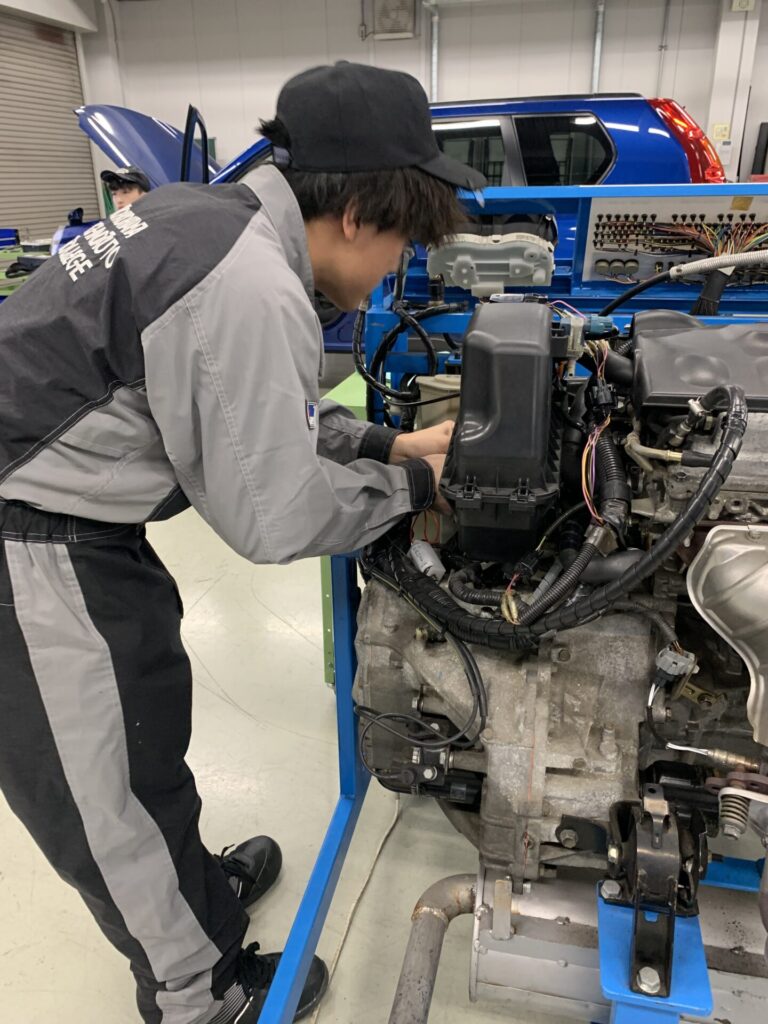 そんな冬晴れの中、1級自動車整備科3年生では「エンジン応用」の実技試験が行われていました。