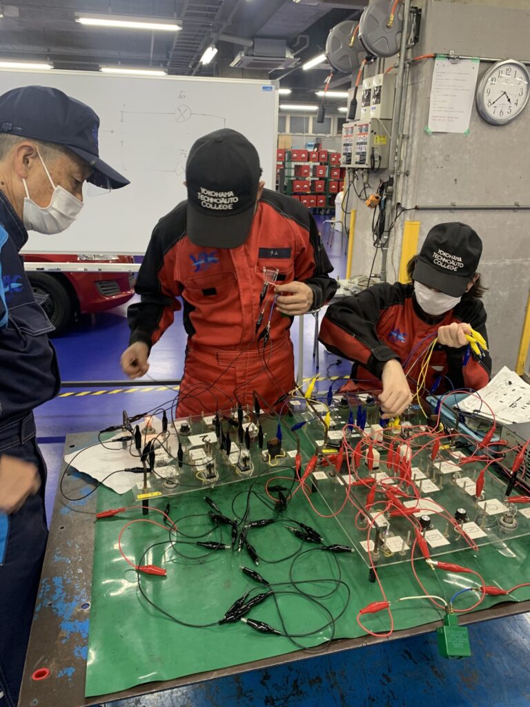 #横浜テクノオート専門学校 #自動車整備科 #1級自動車整備科 #赤いツナギは2年生 #サーキットテスタ #故障探求 #12か月点検 #回路図 #放課後の自主補習 #先生今日もお願いします
