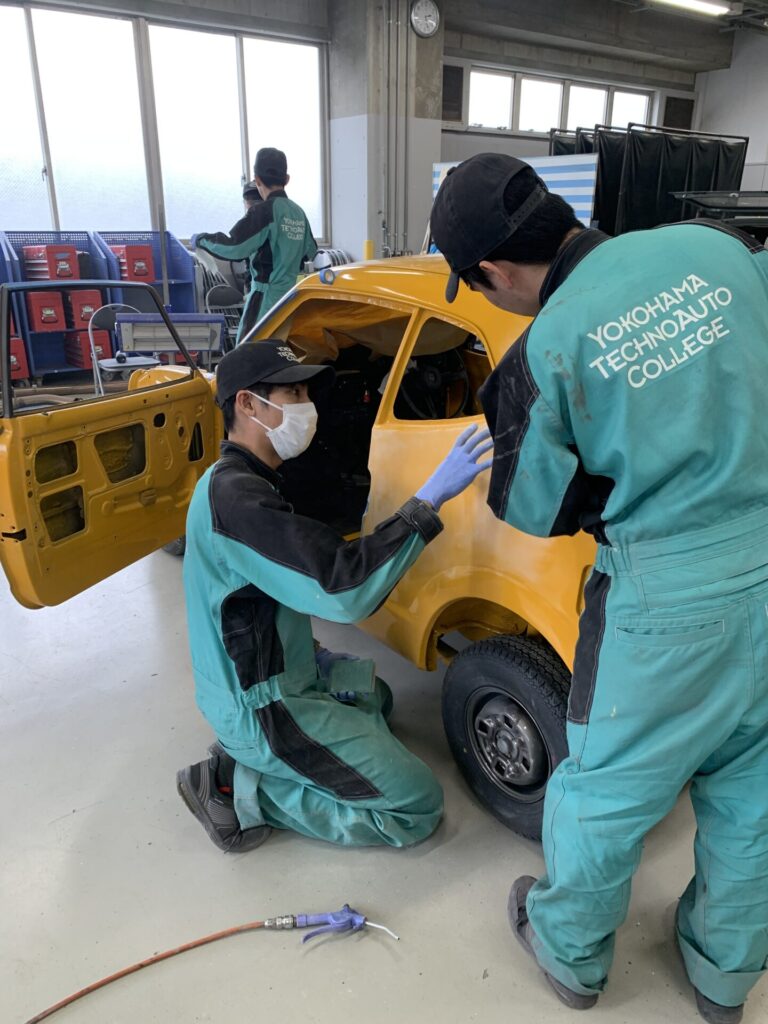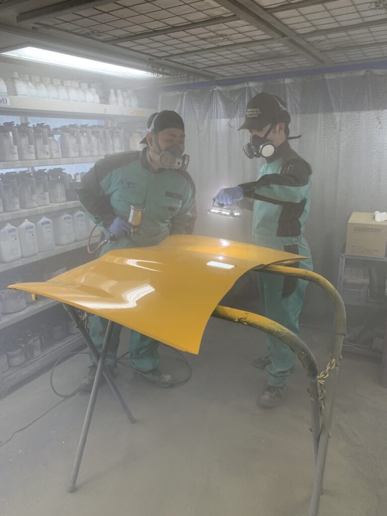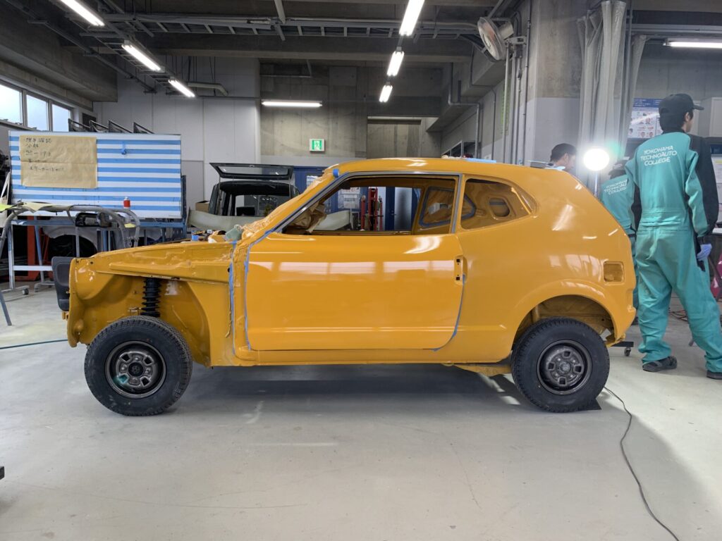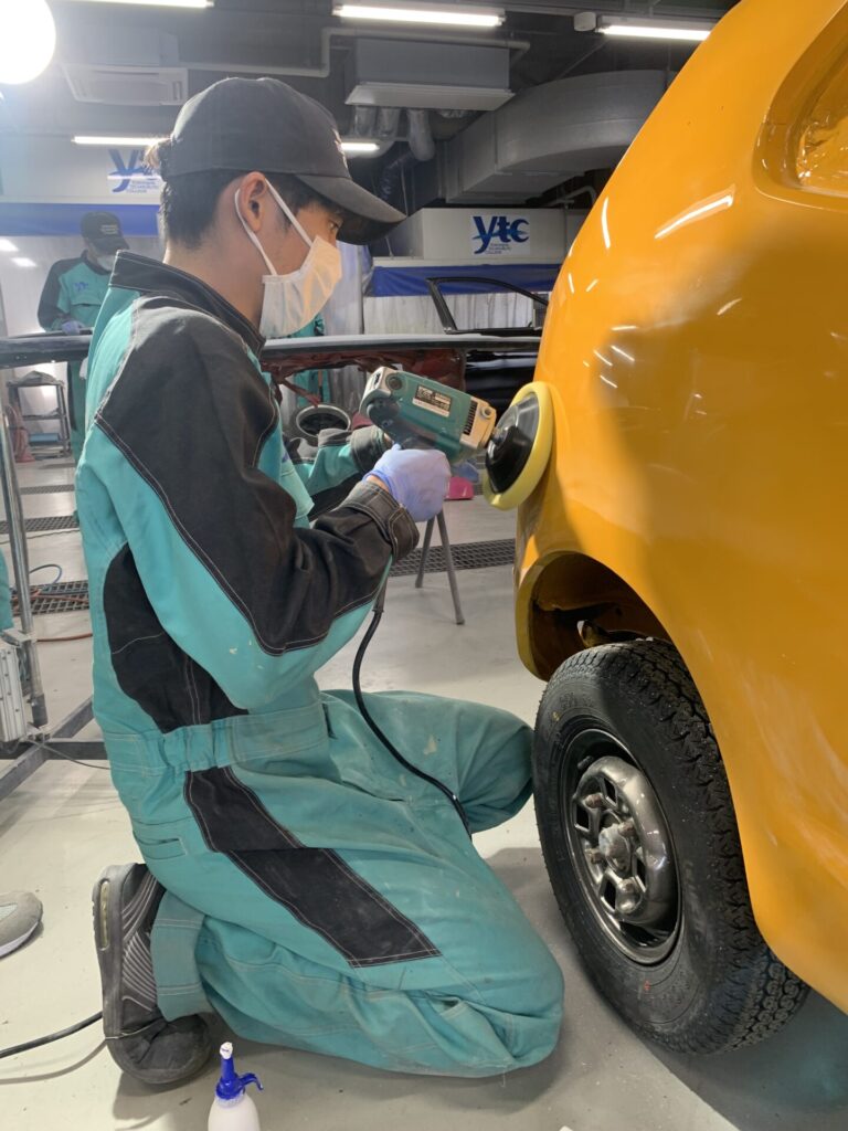 昨日、ボディの色を車体全体に塗りましたが、本日はその手直しです。ベース車両のボディがあまりにボロボロだったため、かなりツギハギをしています。学生たちなりに一生懸命表面を平らにしたつもりですが、やはり一色で塗装してみると細かな凹凸が目立つ箇所がありました。